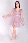 O rochie scurtă de culoare nude, din tulle cu maneci lungi transparente și decolteu generos poate fi o alegere superbă pentru ocazii speciale sau evenimente formale. Tulle-ul subțire și transparent poate adăuga un aspect delicat și feminin la rochie, în timp ce culoarea nude poate fi o alegere elegantă și sofisticată.